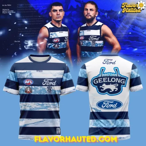 Branding is executed with precision and pride. The front features the AFL badge, the Geelong Cats emblem, and the Ford sponsor logo, all placed with deliberate balance. On the back, the oversized Geelong crest, outlined in electric blue, makes a bold statement — standing tall beneath the stylized Ford insignia. It’s a graphic declaration of the club’s historical weight and enduring strength, framed in a shirt that feels both contemporary and commemorative.